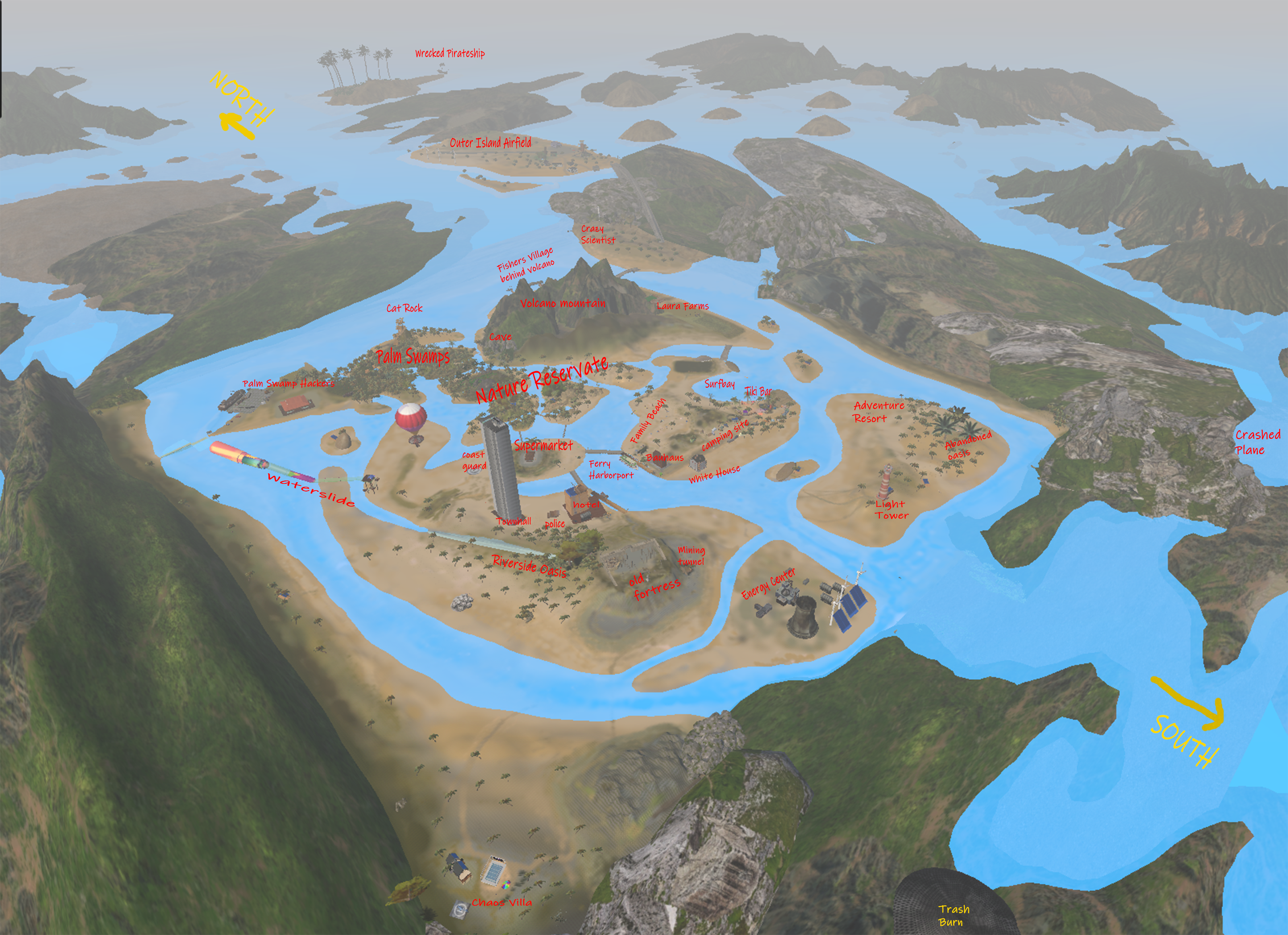 Old Fortress on the Hills – Ancient stone fortress overlooking the island, with a hidden tunnel system underneath connecting to old paths and caves.